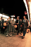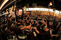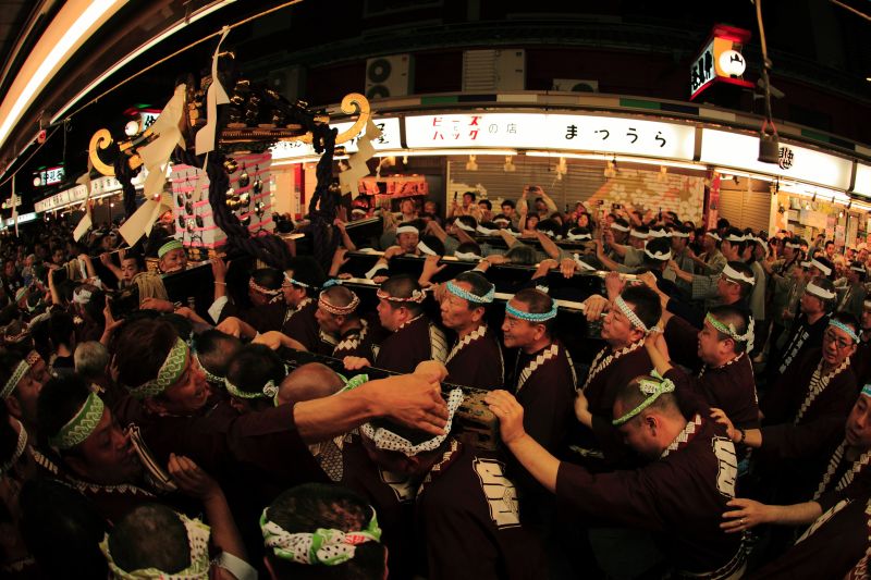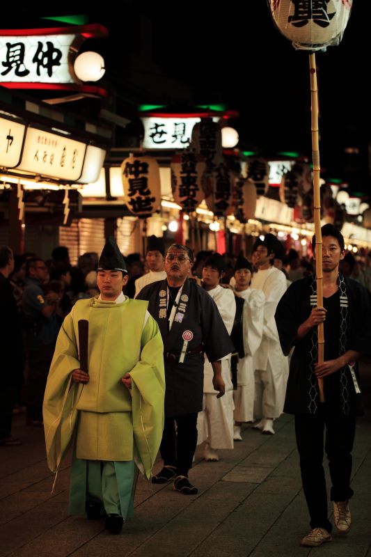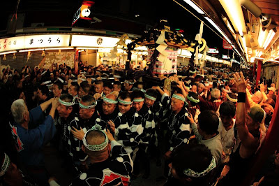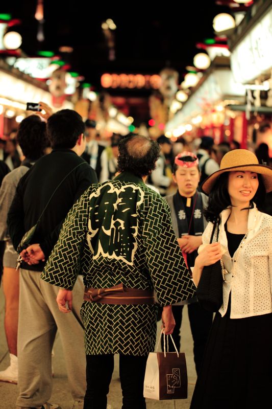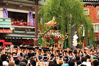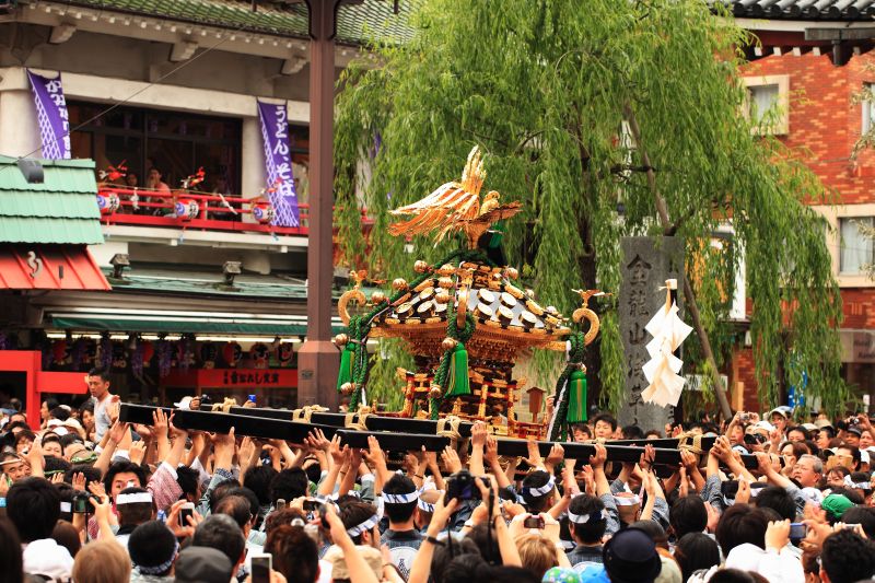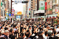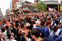 このため古くは三社権現、三社明神と称された。 これが、今から1372年前、西暦628年3月18 日の話。 神社の起源になる。 祭りになったのはそれから600年も後の1312年話。神託があったとも「縁起」は伝えている。今日に三社の本祭礼船渡御がめ始められたことが知られる。 今回はその700年に当たり、更に去年は震災の為自粛したのだから更に今年は熱くなる。 祭りは非常にシンプルで三神を三基の神輿に下ろすことから始まり、それに合わせ氏子の44町の神輿約100基が4日間街を練り歩く 最終日にはまたそれを本殿に返すと至ってシンプルなもの。 掛け声に合わせ祭囃子(Japanese festival music)が聞こえてくると江戸っ子(local people)は血が騒ぐ。 (血が騒ぐ:直訳だとBlood makes noiseだが、翻訳するとexcitementだろう。だがイメージとしてはBlood to boilの方が近いかもしれない。) 最終日に本殿に至る参道に祭囃子とともに神輿が入ってくるとその熱気とともに最高潮に達する。 この日ばかりは老いも若きも男女も関係ない。普段お参りなどしない原宿や渋谷に若者さえも集まってくる。 今年はこの4日間で184万人の人が集まった。